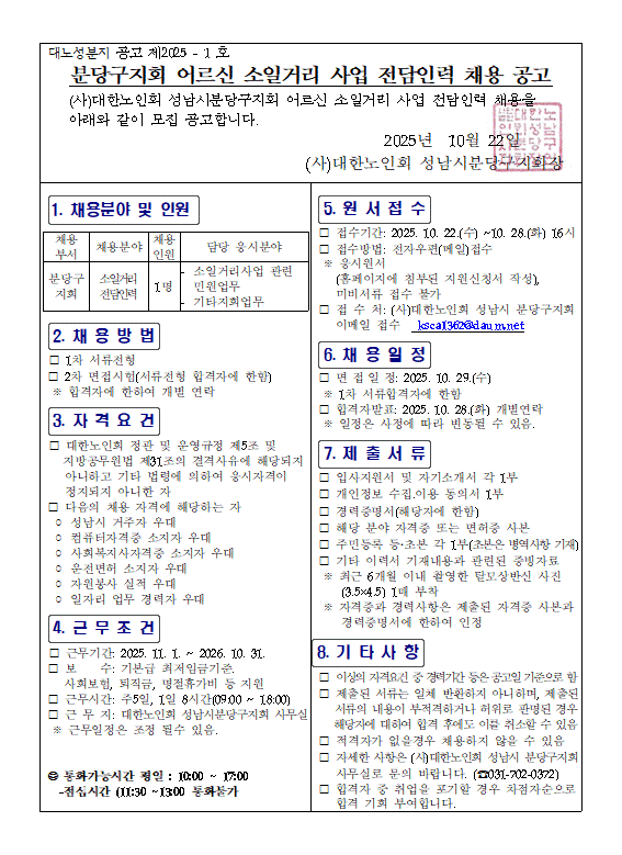 공지사항 > 분당구지회 안내 > 지회장 인사말 > 지회조직도 > 연혁 > 직원소개 > 찾아오시는 길 > 부서별 업무안내 > 노인대학 > 야탑노인대학 > 정자노인대학 > 공지사항 > 공지사항 > 지회소식 > 자료실 > 갤러리 > 자료실 > 취업센터 2025 대한노인회 분당구지회직원 소일거리전담인력 채용 공고 조회수 : 289 등록일 2025-10-22 첨부파일 2025 소일거리전담인력 입사지원 서식(지원서, 자소서, 개인정보동의서).hwp 글 등록시 입력한 비밀번호를 입력해 주세요.
